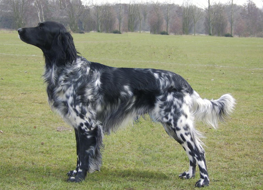 - Colour: Head solid black, body white or blue roan with black patches or ticking (breed standard)3