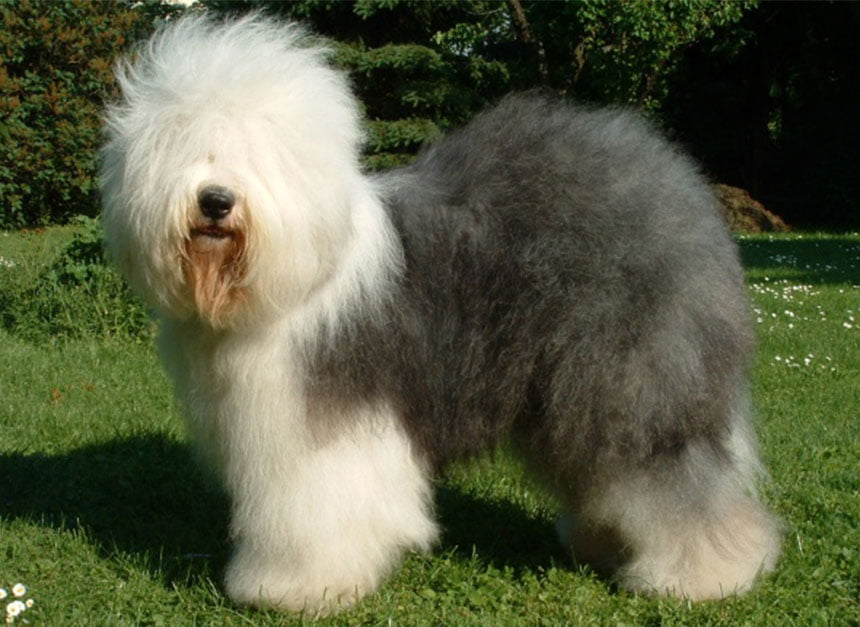 Old English Sheepdog with a full shaggy coat viewed from the side