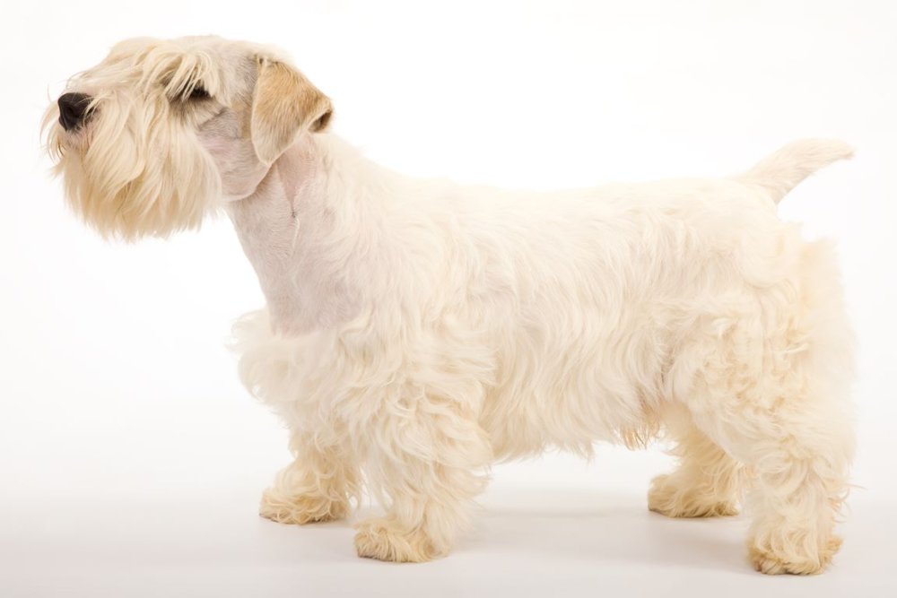 Sealyham Terrier standing with tail visible